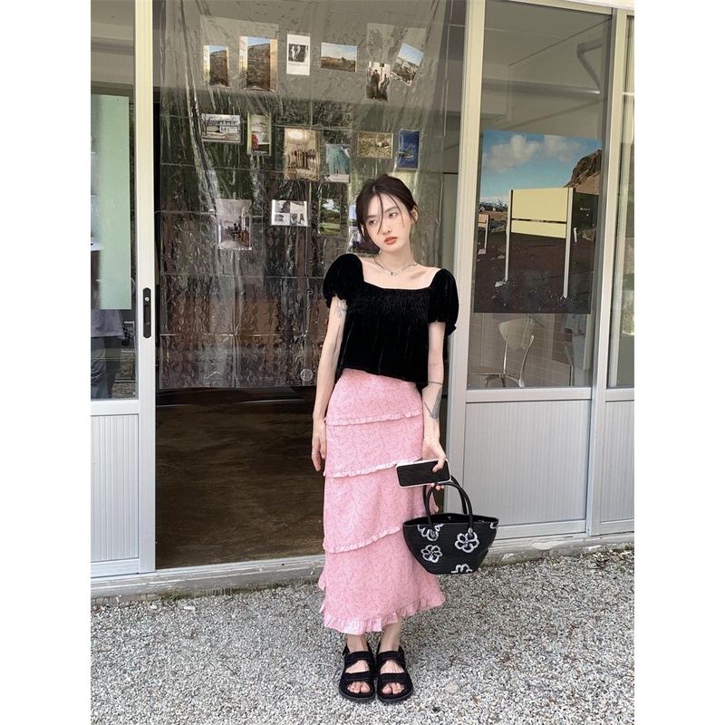 Pakaian Wanita > Batik > Atasan Batik > 08#Real Shot Boneka Beludru Hemat Biaya, Atasan Bahu Terbuka Kerah Persegi+Gaun Floral Panjang Telin