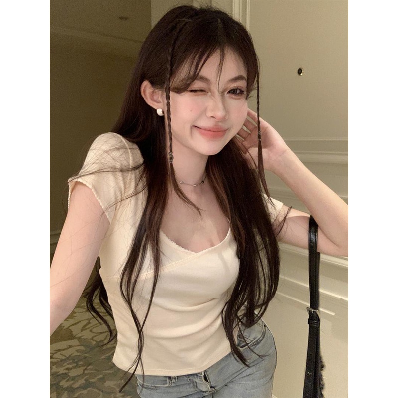 08#Tembakan Nyata Hemat Biaya vLengan Pendek Kerut Renda Silang KerahTT-shirt
