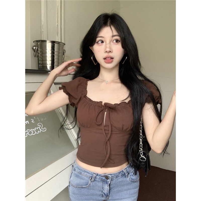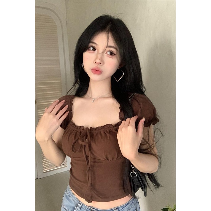 08#Tembakan Nyata Hemat Biaya Kerah Persegi Tali Berongga Renda Puff Lengan Murni KeinginanTT-shirt