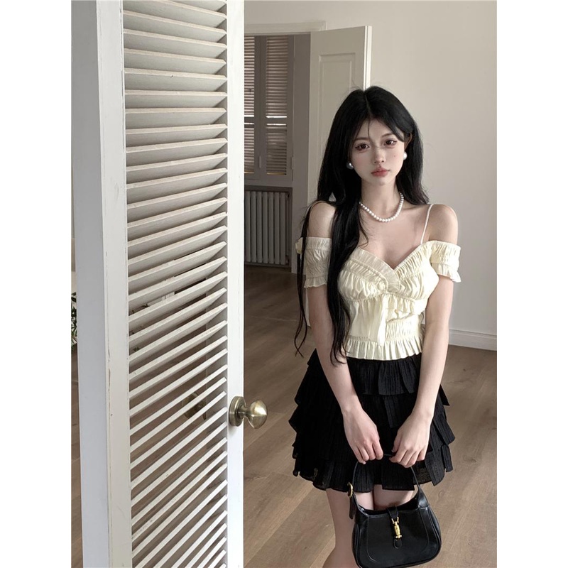 Detail 08#Tembakan Nyata Hemat Biaya Bahu Terbuka Gaya Prancis Keinginan Murni, Atasan Tidak Rata Berlipat