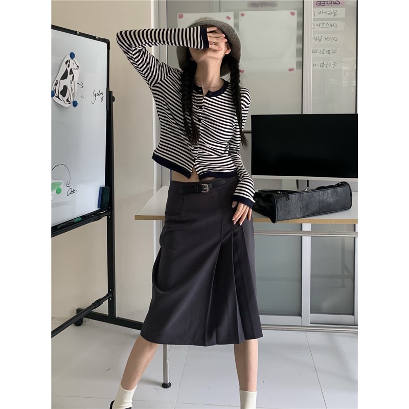 Detail 08#Tembakan Nyata Hemat Biaya Garis-garis Lengan Panjang Kancing Kerah BulatTT-shirt+Dengan Sabuk Ke