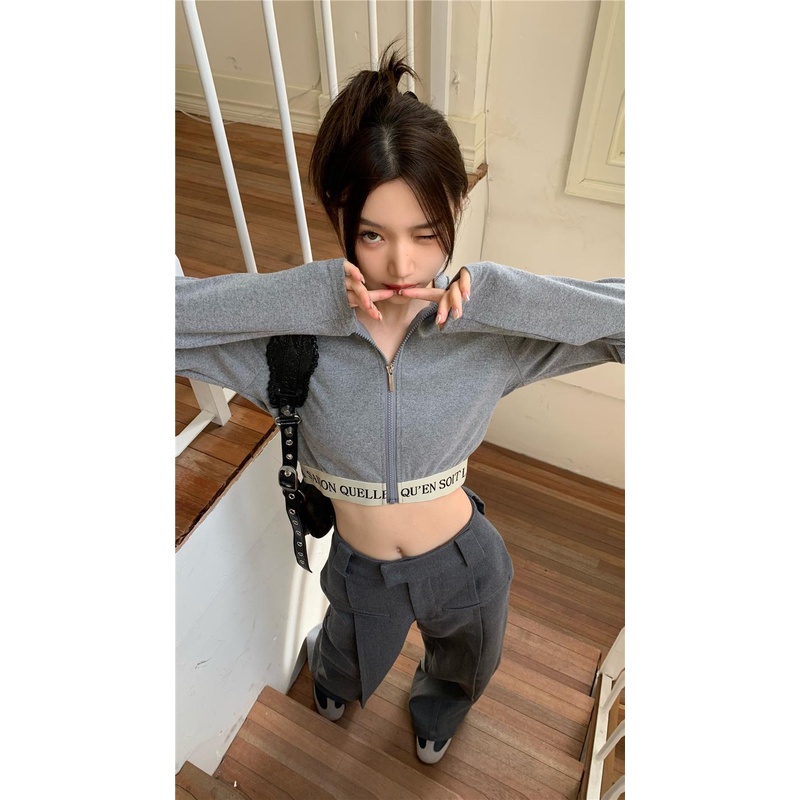Detail 08#Tembakan Nyata Hemat Biaya Ritsleting Bertudung Huruf Atasan Lengan Panjang Pendek