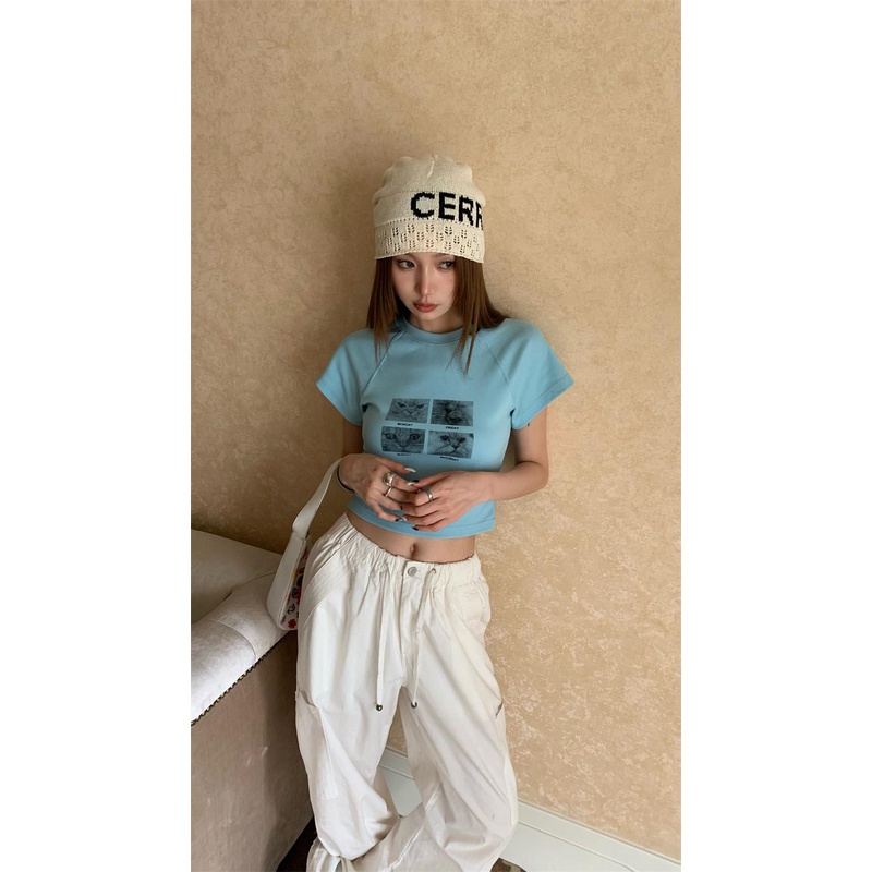 Fashion Muslim > Outerwear > Outerwear Lainnya > 08#Tembakan Nyata Hemat Biaya Pulover Kerah Kru Retro Motif Kucing, Lengan PendekTT-shirt