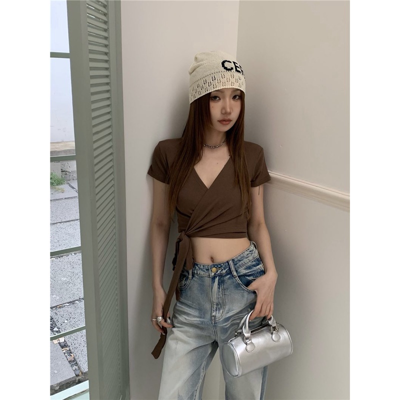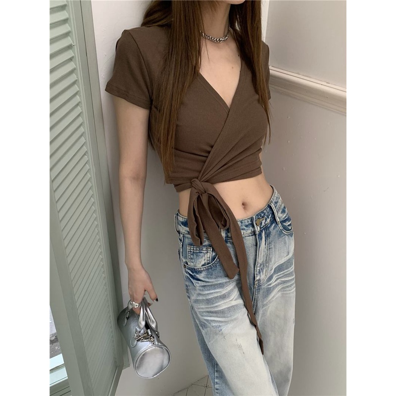 Detail 08#Tembakan Nyata Hemat Biaya VLengan Pendek, Satu Buah Tali Silang KerahTT-shirt