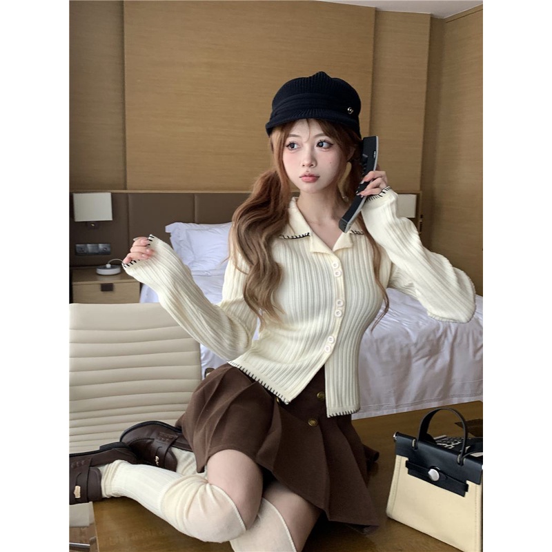 Fashion Muslim > Atasan Muslim Wanita > Kemeja, Blouse, & Dalaman Blouse > 08#Tembakan Nyata Hemat Biaya RasapoloSweter Kardigan Rajut Garis Cerah Kerah