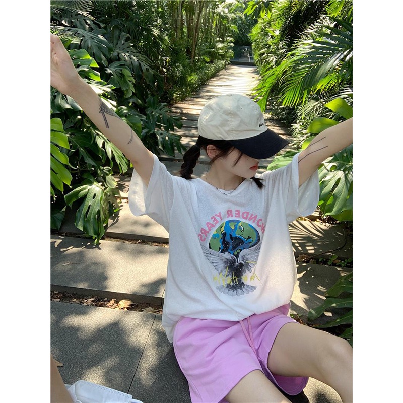 Detail 08#Tembakan Nyata Hemat Biaya Lengan Pendek Cetak LonggarTT-shirt+Celana Olahraga Kasual Merah Muda