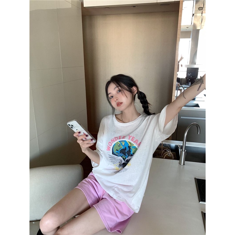 08#Tembakan Nyata Hemat Biaya Lengan Pendek Cetak LonggarTT-shirt+Celana Olahraga Kasual Merah Muda