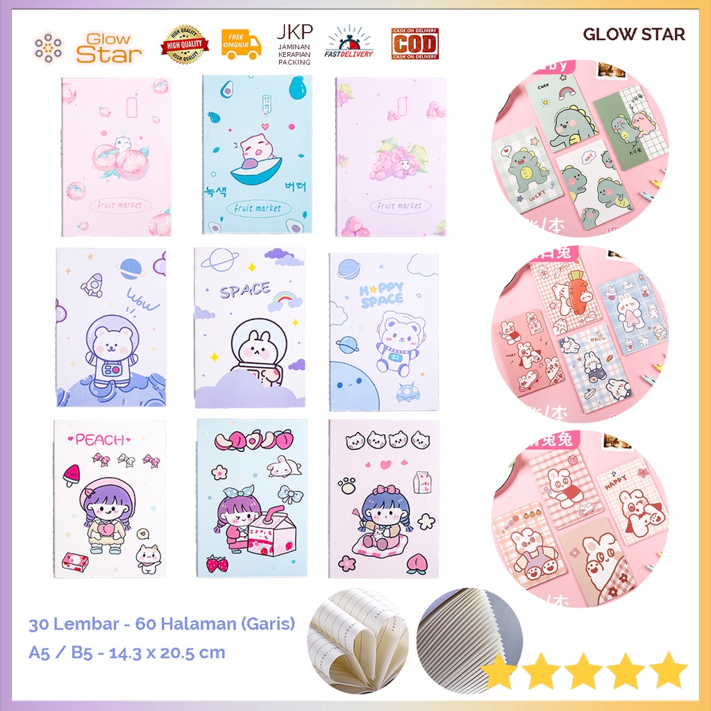 Harga untuk 1 PCS - Random Varian sesuai theme yang dipilih Satu Theme isi 5, jika membeli 5 kami berikan variasi yang berbeda beda 30 Lembar, 60 Halaman A4: 20.5 x 14.3 x 0.3 cm B5: 25.1 x 17.2 x 0.3 cm