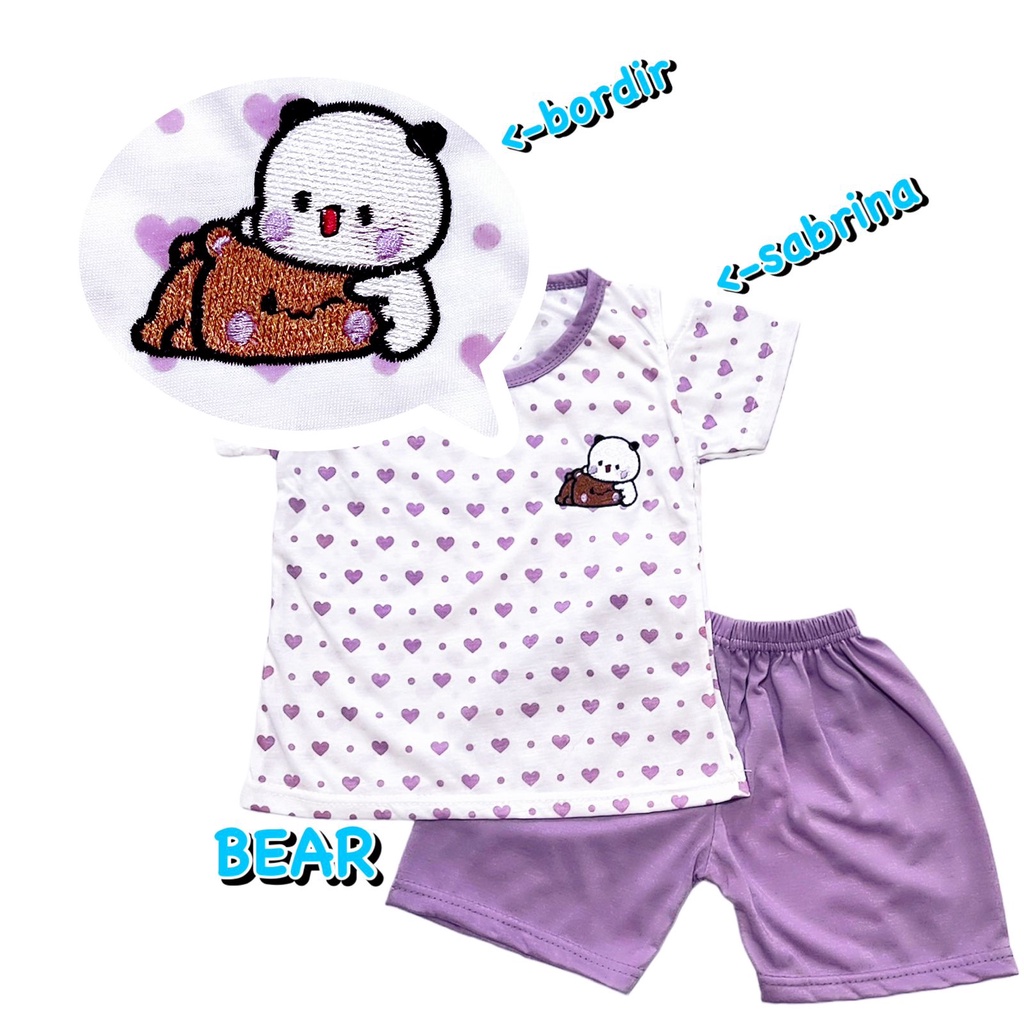 (1 KG MUAT 9 STEL) BAJU SETELAN PENDEK FASHION SABRINA ANAK PEREMPUAN/CEWEK BAHAN KAOS KATUN BORDIR POLKADOT LOVE LILAC/UNGU BEAR/BERUANG