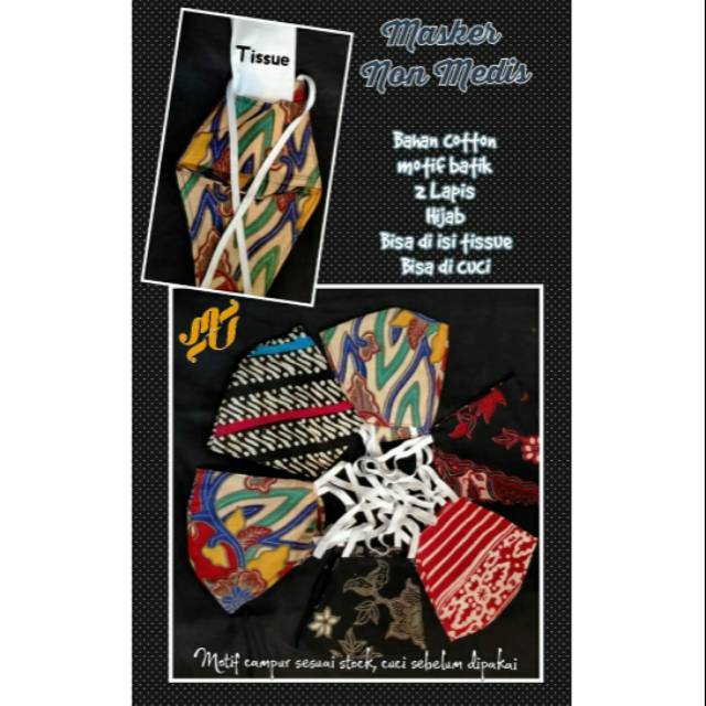 1 lusin masker non medis batik tali hijab ada kantong tisunya motif random 1 lusin = 12pc Detail ukuran dan bahan ada di GAMBAR TULIS warna dan ukuran di CATATAN PEMESANAN Stok barang berubah2...