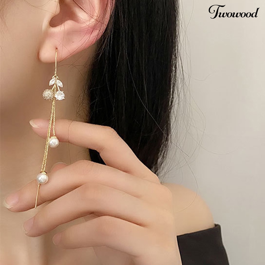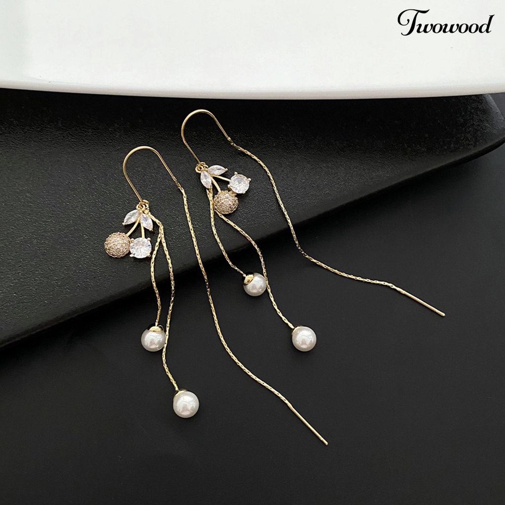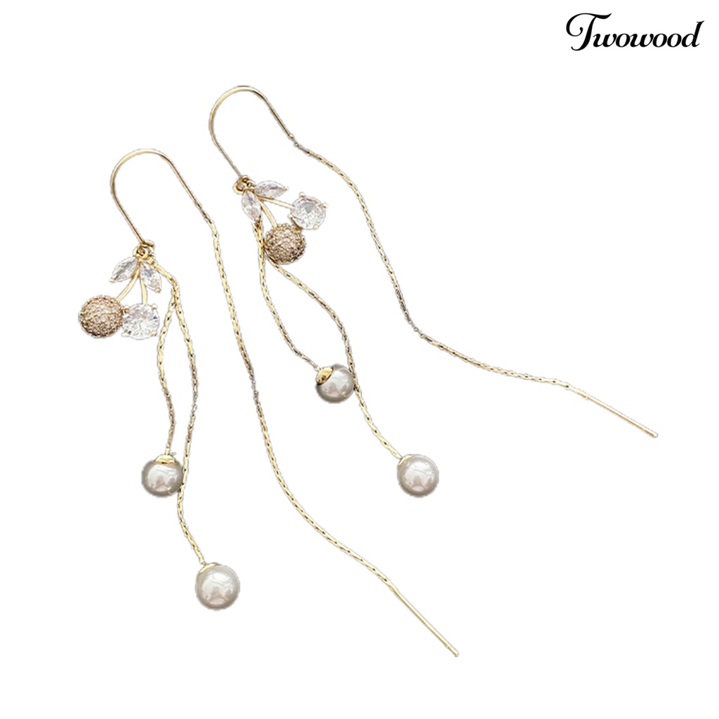 Detail 1 Pasang Anting Rumbai Panjang Desain Cherry Aksen Mutiara Imitasi Untuk Pesta Pernikahan