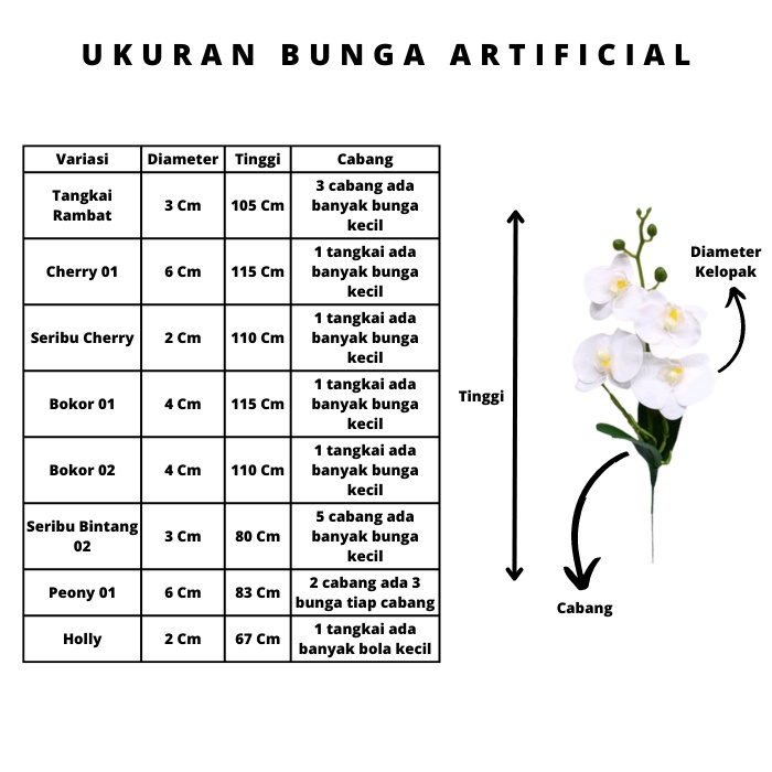📦 Spesifikasi Produk : Ukuran : Tertera di foto slide 3 Variasi : 7 Variasi Jenis Warna : Tuliskan kode warna yang diinginkan di note pesanan (*Note --> Warna yang tertera di foto produk dipengaruhi oleh pencahayaan pada saat proses pemotretan, resolusi dan kualitas layar yang digunakan pada saat memilih produk. Oleh karena itu penjual TIDAK MENJAMIN 100% sama antara warna yang tertera dengan produk asli) Bahan : Latex Plastik Isi Kemasan : 1 Tangkai Bunga Kegunaan : Hiasan dekorasi rumah, buket bunga, aksesoris rumahan, pajangan, dll