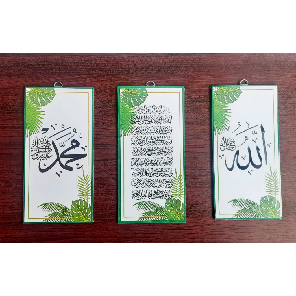 kaligrafi set isi 3pcs ukuran @10x20 cm ukuran semua 20x30cm (3biji) material mdf 4mm dilaminasi depan belakang sudah terpasang gantungan dan aman bila terpasang ditembok yg lembab sekalipun