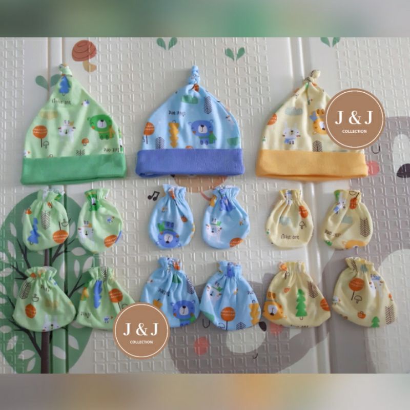 1 set terdiri dari Topi Bayi, kaos tangan dan kaos kaki bahan kaos dengan motif yang lucu dan BerSNI dijamin bayi anda semakin menggemaskan dan lucu. tersedia 3 warna hijau . biru dan kuning