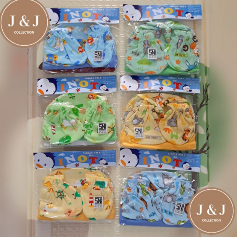 Detail 1 set Topi Bayi dan sarung tangan kaki bayi merk INOT