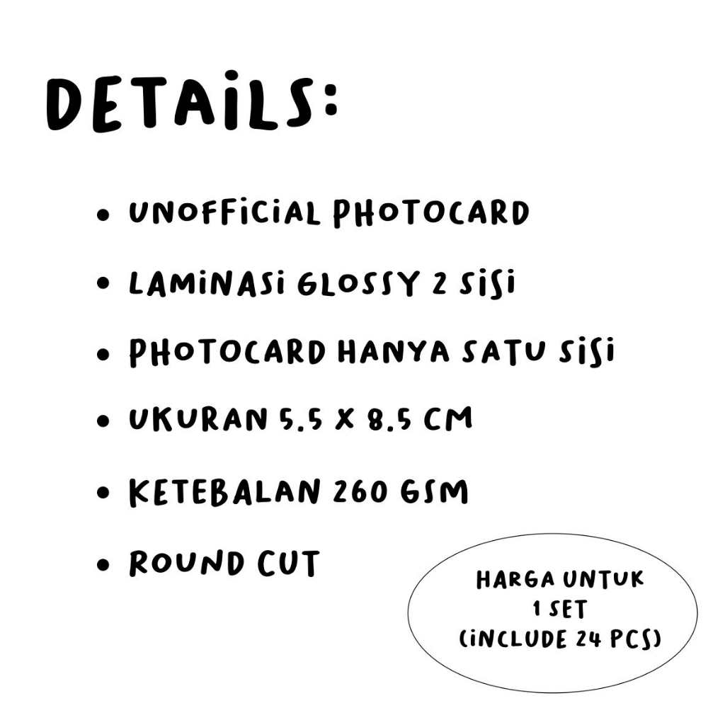 - Keterangan • Jumlah per set 24 pcs • Bahan kertas art paper 260gsm • Hanya satu sisi saja • Laminasi Glossy dua sisi • Ukuran 5,5 x 8,5 cm • Round cut