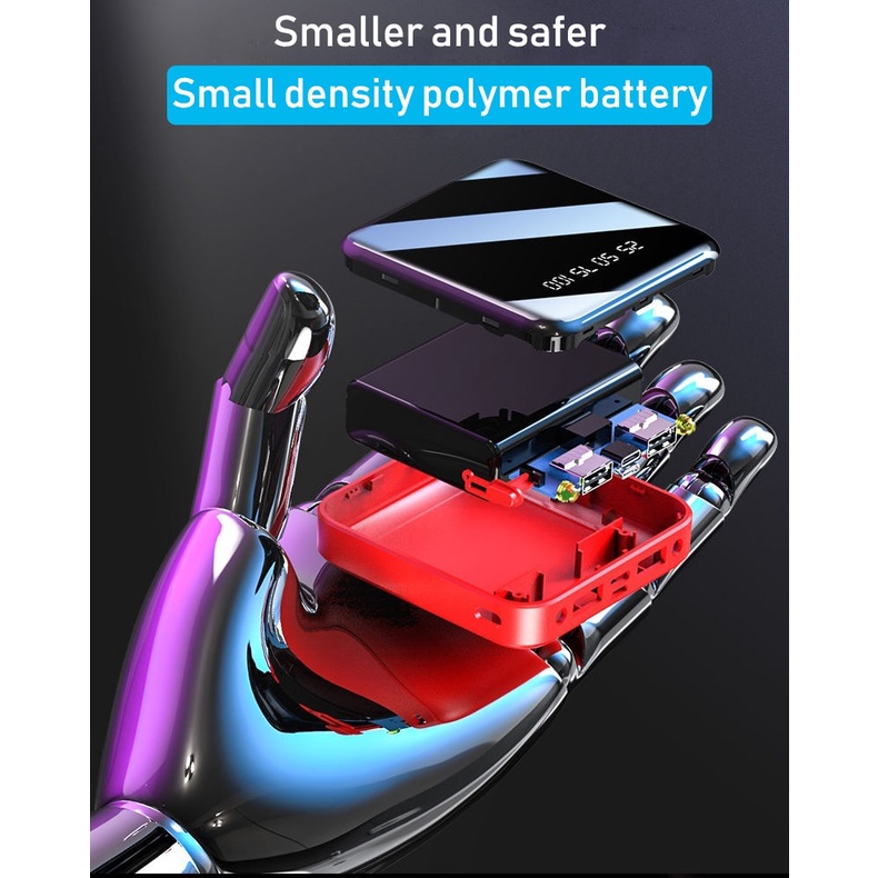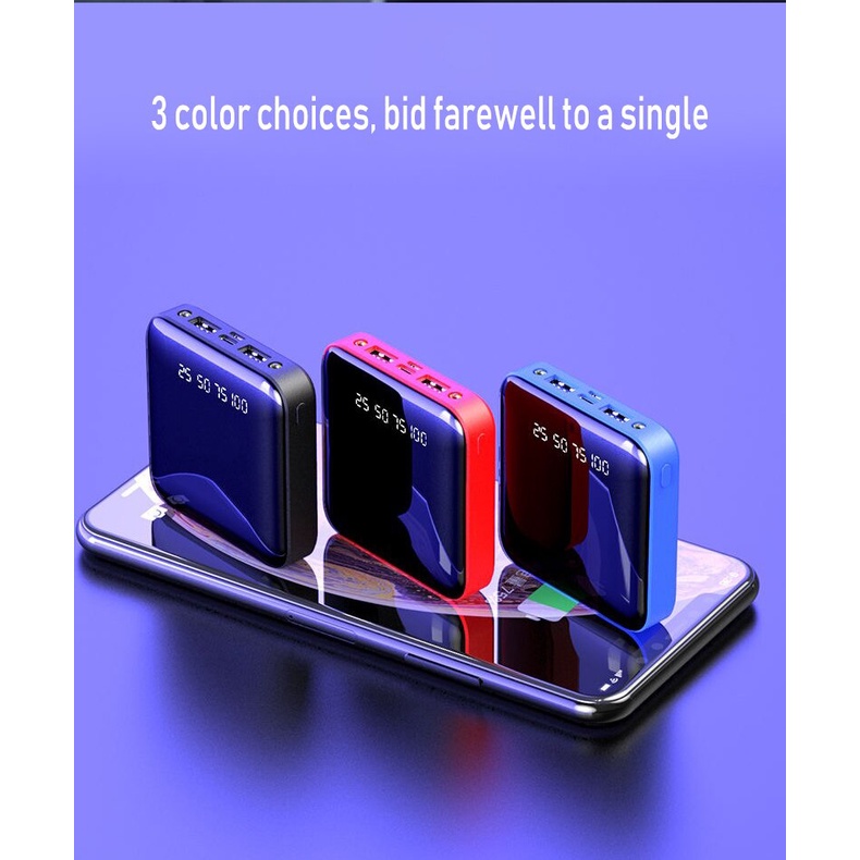 Powerbank ini hadir dengan desain mini yang elegan dan cocok di padukan dengan smartphone Anda. Dengan kapasitas rated 12000 mAh, Anda dapat mencharge gadget Anda berulang kali tanpa perlu takut akan kehabisan daya, sangat praktis dan efisien. Fitur Baterai Kapasitas Tinggi 12000 mAh bawaan Powerbank ini menggunakan baterai dengan kapasitas rated besar, yaitu 12000mAh atau kapasitas asli 8000 mAh yang dapat Anda gunakan untuk mencharge gadget Anda berulang kali tanpa perlu takut akan kehabisan daya. Pengisian Cepat USB 1 A Ganda Power bank ini memiliki dua output USByang memungkinkan Anda untuk mengisi ulang daya baterai gadget Anda secara bersamaan. Dua port tadi mampu mengeluarkan daya dengan arus hingga 1 A sehingga dapat mengisi daya baterai dengan cepat. Kecil, Sederhana, dan Portabel Power bank memiliki desain yang kecil dan sederhana. Ukurannya yang kecil membuatnya dapat dengan mudah dibawa dengan mudah. Selain itu, power bank memiliki bentuk yang sederhana, yaitu kotaksehingga Anda dapat dengan mudah memasukkan saku baju atau tas Anda dengan mudah. BentukElegan Powerbank ini hadir dengan desain bentuk yang elegan, cocok dipadukan dengan smartphone Anda. Power Bank ini memiliki full screen mirror serta double light LED yang dapat Anda gunakan sebagai senter darurat.