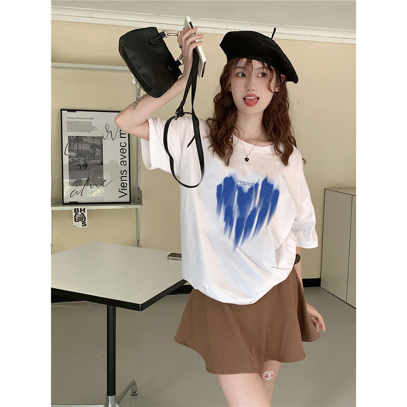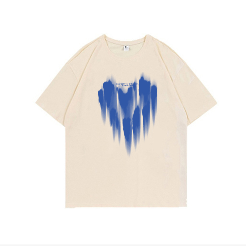 Detail 100% Katun Heart Kaos Lengan Pendek Cream Atasan Wanita Oversize Printed T-shirt Kekinian Korean Style/kaos import wanita jumbo