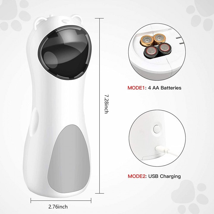 Specification Product Name: Laser Light Cat Toy Product Model: W1 Power Supply: USB (Cable Included) or 4x AA Batteries (NOT INCLUDED) Material: Plastic