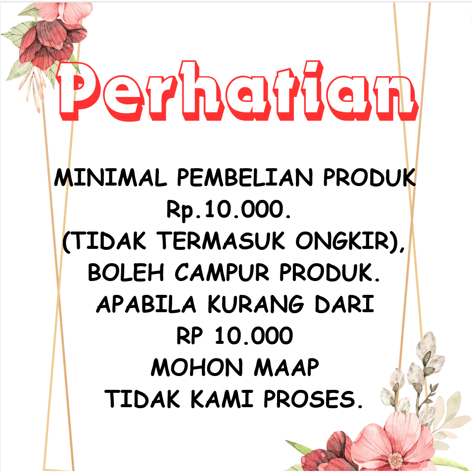 MINIMAL PEMBELIAN PRODUK 10.000 (TIDAK TERMASUK ONGKIR), BOLEH CAMPUR PRODUK APABILA KURANG DARI 10.000, MOHON MAAP TIDAK KAMI PROSES