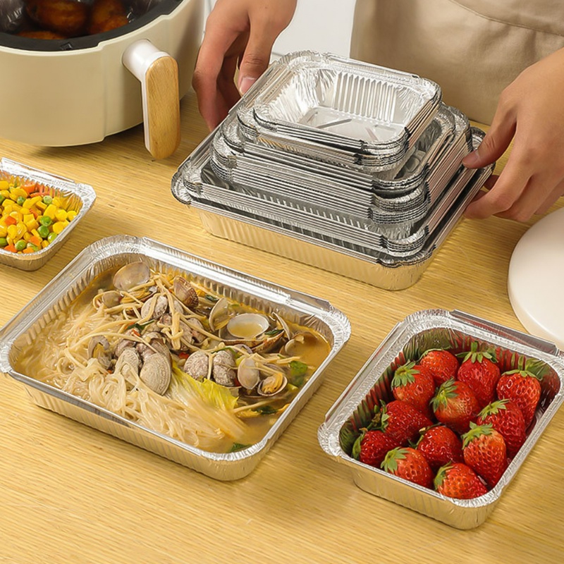 Detail 10pcs Panci Kukus Aluminium Foil Persegi Panjang Sekali Pakai/Air Fryer Nampan Anti Lengket Tahan Panas/Alat Baking Masak Dapur