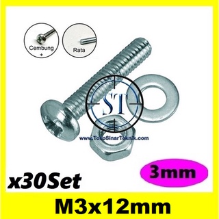 x30 Set Baut Mur Ring M3 x 12mm JP3 M3 3mm Ukuran M3x12 3x12mm 3x12 3x12mm Kepala Cembung