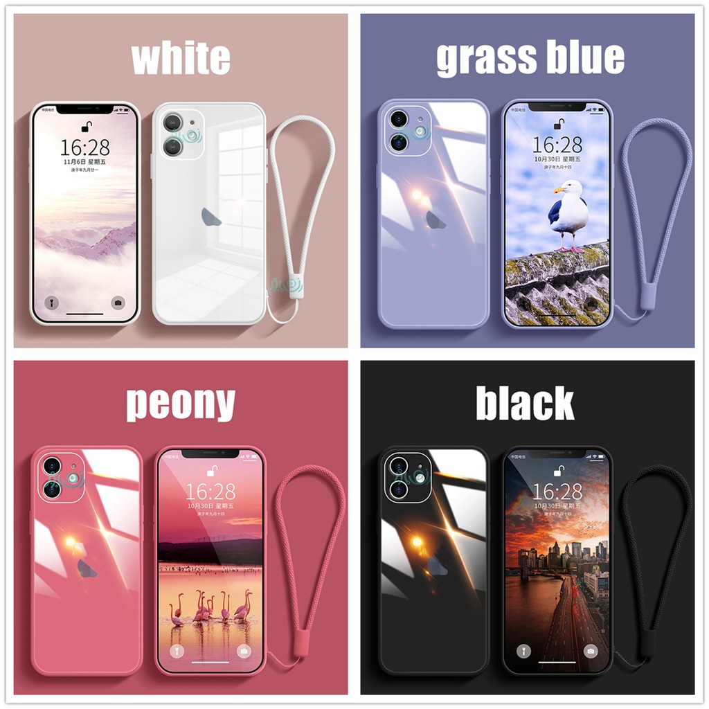 【Free Lanyard】Macaron Casing iPhone 11 12 Pro MAX XS MAX XR X 6 6S 7+ 8 Plus SE 2020 Tempered Glass Case Square Silicone back cover