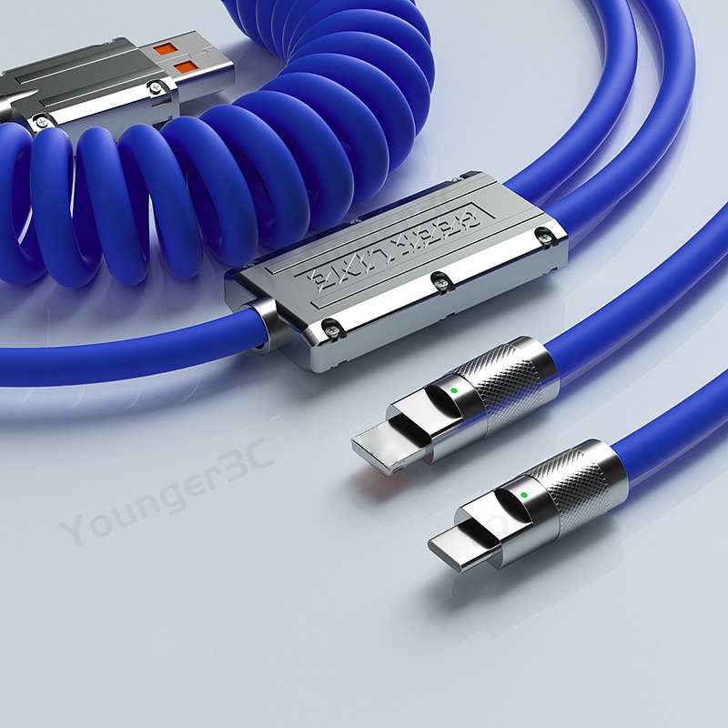 Handphone & Aksesoris > Kabel, Charger, & Konverter > Kabel & Adaptor Handphone > 120w Dual Head Super Fast Charging Cord 2in1 Zinc Alloy Spring Telescopic Data Line 6A Flash Charging Extended Spring Cable Untuk ios Type C