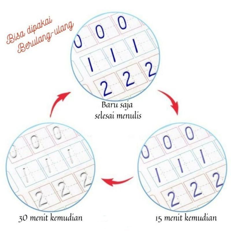 ♥️KEUNGGULAN♥️ 1. Reuseable, bisa dipakai berulang-ulang 2. Tidak perlu hapus manual pake eraser atau sejenisnya, tinta bisa hilang sendiri 3. Tidak hanya handwriting practice skill, di dalam buku juga terdapat kosakata b.inggris 4. Colorful, menarik perhatian anak-anak agar tidak monoton 5. Terdapat Sillicone Holder, berfungsi mengajari dan memudahkan anak untuk memegang pulpen 6. Sarana belajar mengajar anak ga pake ribet.