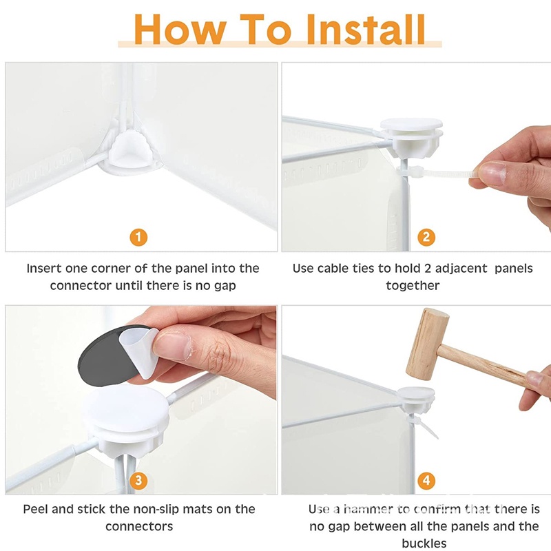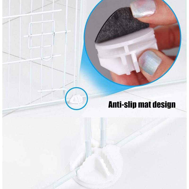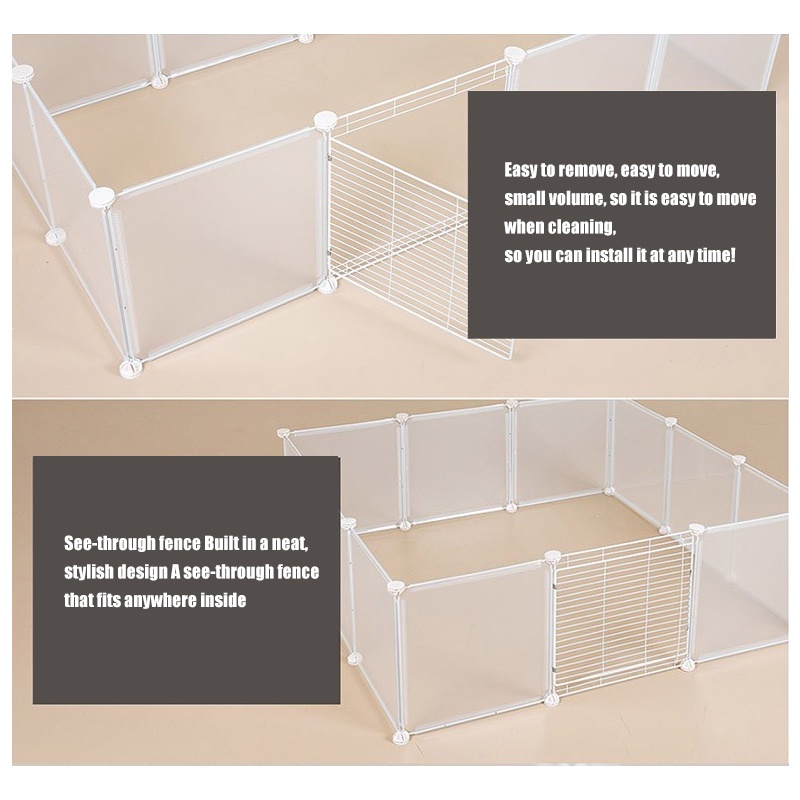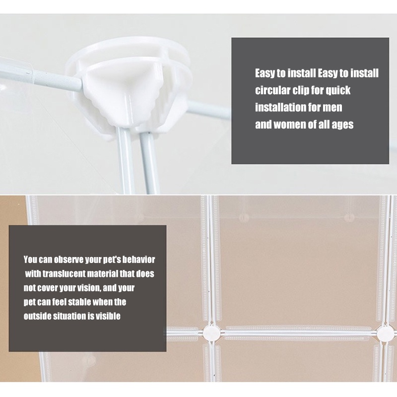 Kandang anjing serbaguna, masing-masing sisi 35x35cm. Anda bisa mendesain kandang sendiri, cocok untuk ruangan Anda sendiri Jaring kawat elektrostatis, jaring kecil, dapat memberi makan burung, kelinci, serangga, kucing. Mudah dilepas, mudah dipindahkan, kreatif Pasak plastik 8 arah, sehingga sangat nyaman Lembaran plastik rangka besi,