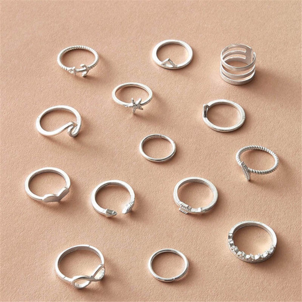 Detail 14 pcs Sederhana dan Modis Retro Gaya Bohemian Cincin Perak Antik Set 14-piece Set untuk Wanita