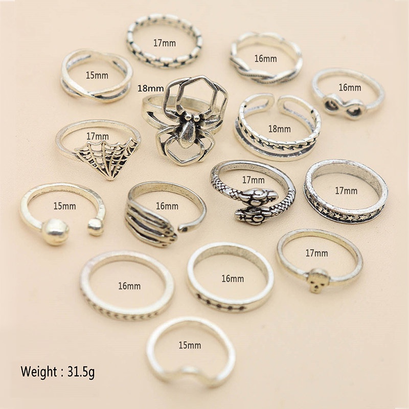 Aksesoris Fashion > Cincin > 15pcs/set Punk Rock Stylish Spider Snake Rings Set Untuk Wanita Tak Terbatas8 Hantu Tidak Teratur Geometri Bersama Cincin Perhiasan