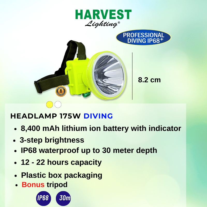 175W Headlamp Professional Diving merek HARVEST LIGHTING, menjadi andalan bagi penggemar olah raga atau kegiatan outdoor, seperti: - Kegiatan menyelam / Diving dengan IP68 (bisa bertahan sampai dengan kedalaman 30 meter) - Pelengkap kerja bagi Teknisi bengkel/AC/kontraktor/Penambang, dll. - Peralatan penting untuk aktivitas Camping/travelling atau kegiatan outdoor lainnya, - Membantu aktivitas Nelayan atau pencari ikan/kodok, dll. - Membantu aktivitas Petani untuk kegiatan di sawah/ladang/rawa-rawa - Lain-lain