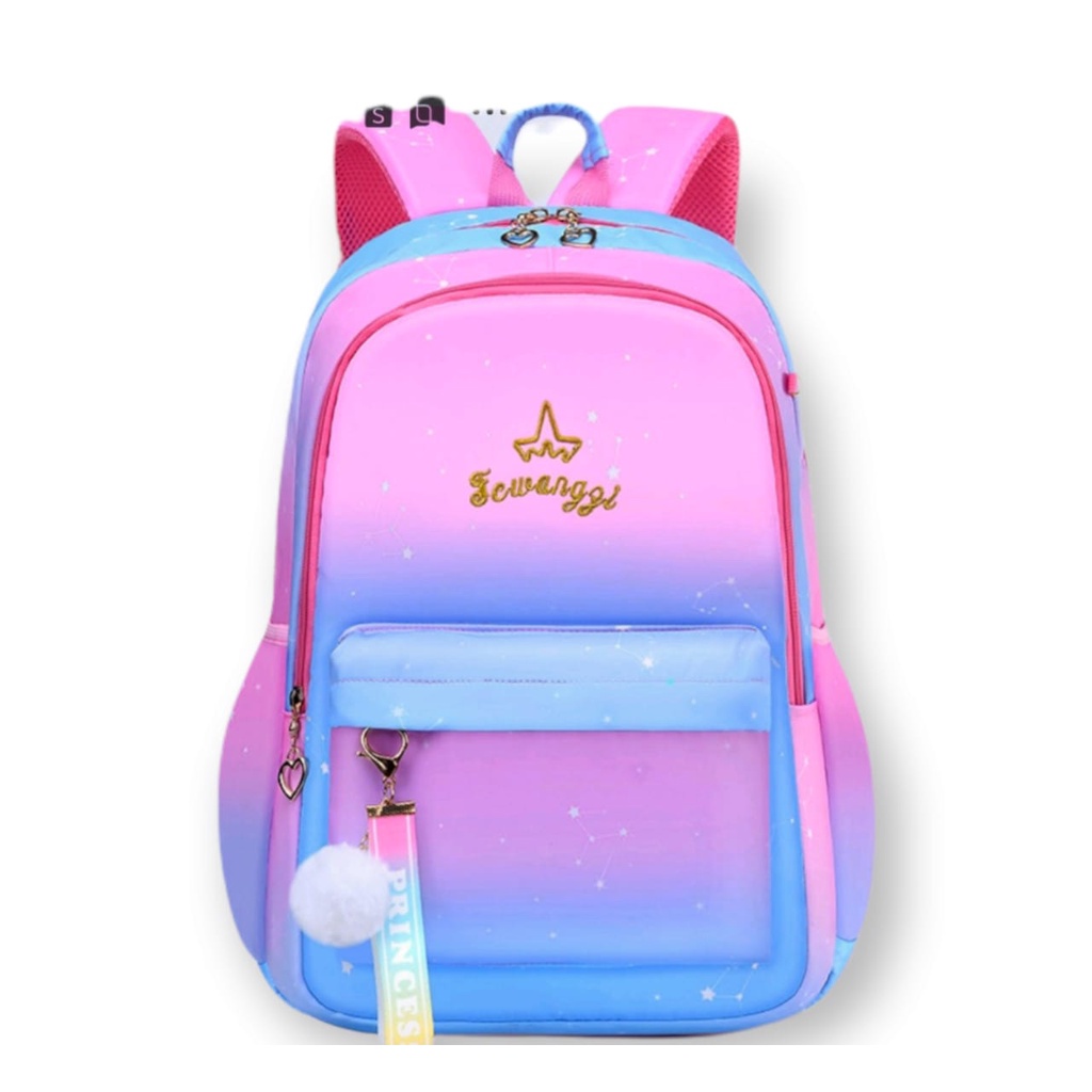 Model: Tas Ransel Sekolah Gender: Perempuan SD - SMP Design: Colorful edition Fitur: 3 kantong ruang, waterproof (tahan air) Bahan: Poliester Ukuran: P x L x T = 32 x 18 x 43 cm 4 Warna: Full pink, blue - pink, purple - pink, full blue