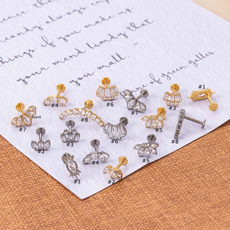 Detail 1biji Bentuk Mahkota G23 Baja Titanium Dengan Zirkon Kepala Datar Bibir Helix Anting Tindik Tubuh 16Gauge Benang Internal Hypoallergenic