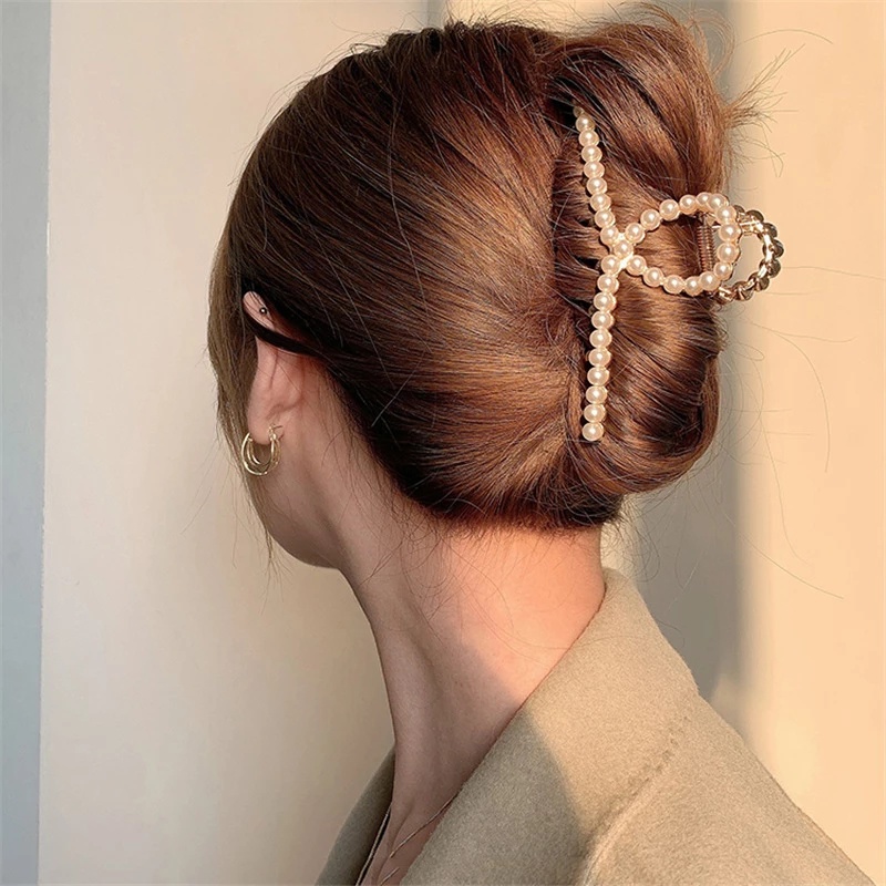 Product name: pearl rhinestone hair clip Hairpin type: grabbing clip Color: golden Treatment process: electroplating Style: Women's Style: stylish and simple Applicable scenarios: dating, work, school, daily, etc. Material: Alloy Size: about 11.5cm in length Quantity: 1