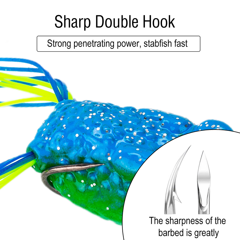 3.Kait ganda tertanam di perut umpan katak dan tersembunyi di permukaan tubuh katak. Umpan ini membantu menembus umpan dengan cepat dan kuat pada saat umpan digigit oleh ikan. Ini membantu menembus umpan dengan cepat dan kuat pada saat ini umpan digigit oleh ikan.