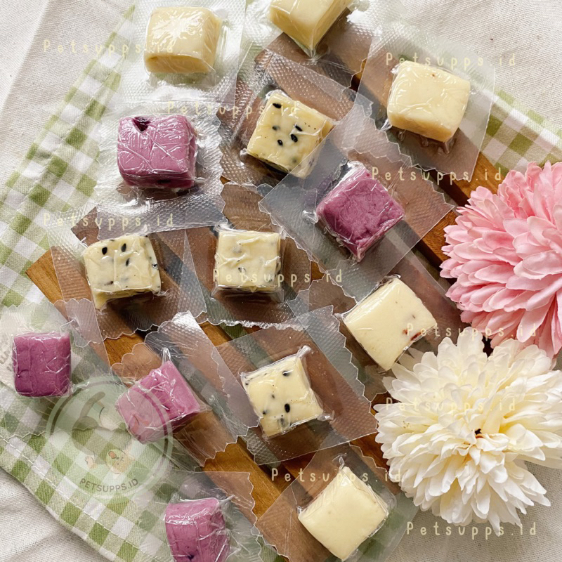 dengan bentuk cheese cube yang sudah divacum seal jadi amaaaan puol no bocor, jadi beneran terjaga kehigeniesannya dan keamanannya yah, wanginya susu banget, no sugar added only goat milk karena made only for pets!