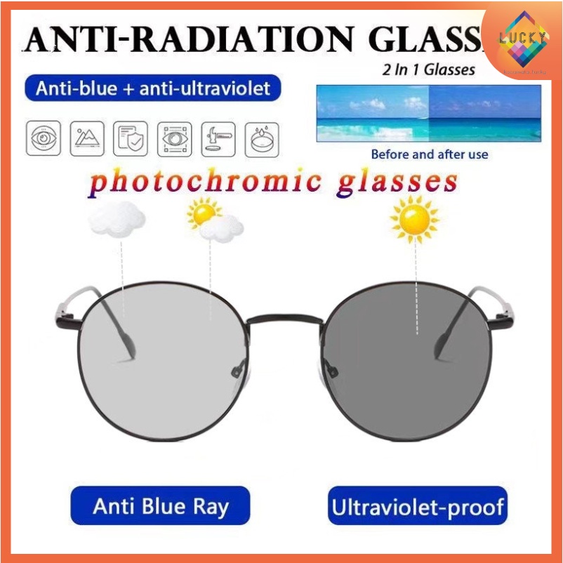 2 In 1 Kacamata lensa photocromic anti radiasi wanita pria kacamata bingkai bulatTitanium perubahan warna fotocromic New