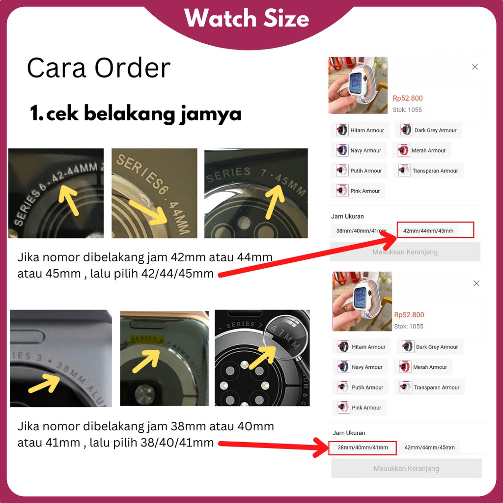 1. Periksa bagian belakang jam tangan Anda: 2. Jika ukuran yang tertulis adalah 38mm atau 40mm atau 41mm , Kemudian pilih 38/40/41mm Strap 3. Jika Ukuran yang tertulis 42mm atau 44mm atau 45mm , Kemudian Pilih 42/44/45mm Strap 4. Pilih warna
