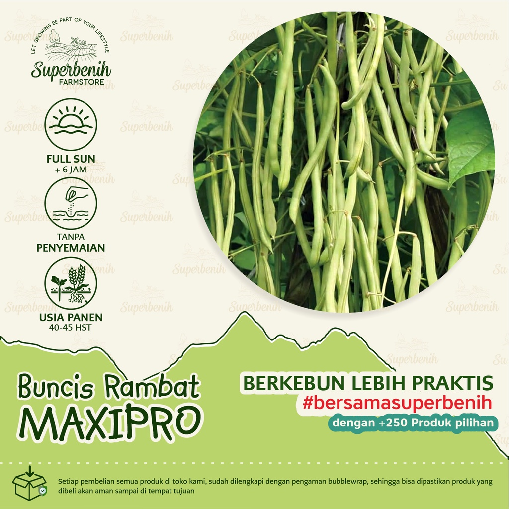 MAXIPRO adalah buncis tipe polong putih dengan warna biji hitam. Cocok untuk dataran rendah - tinggi. Panjang polong 16 - 18 CM. Produksi tinggi (0,7 kg) per tanaman. Tahan panyakit (BW, BC MV, karat daun / rust). Umur panen genjah (40 HST). Tahan simpan (> 6 hari). Cepat merambat. Tahan rontok / gugur bunga