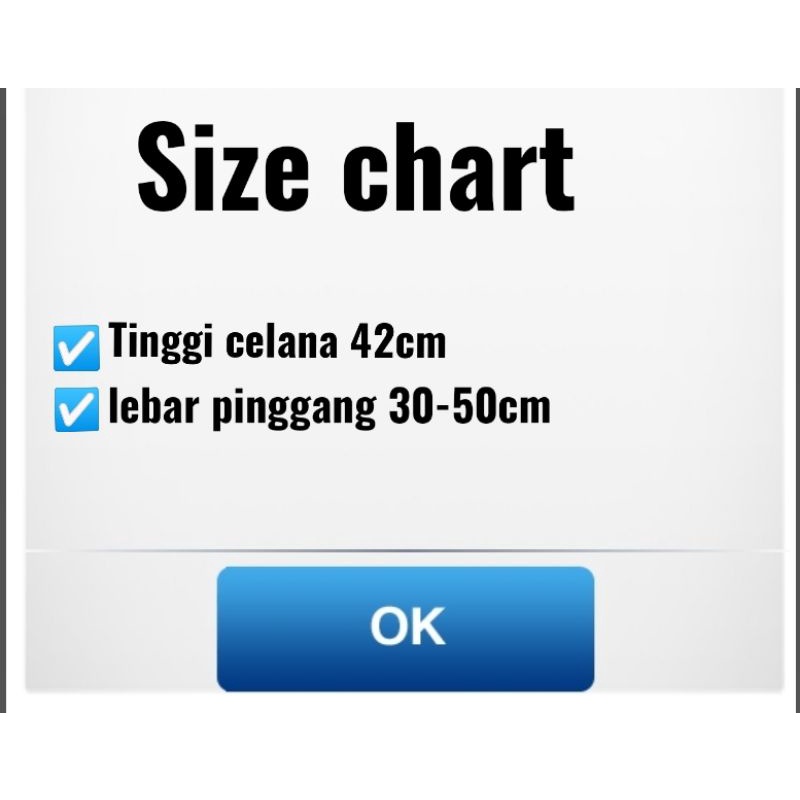 Lingkar pinggang ukuran 60-100 cm Lingkar paha 64 cm Tingg celana 43 cm