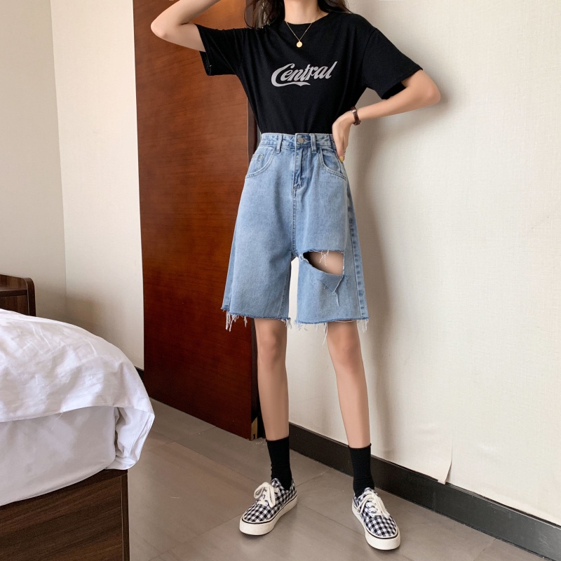 Detail 2023 New Biru Highwaist Robek Celana Jeans Pendek Wanita Rawis