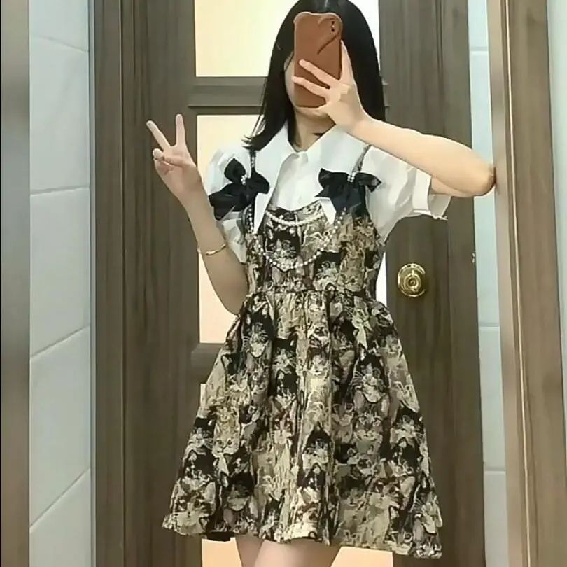 2023Setelan Dua Potong Gaya Klasik, Gaun Tali Kucing Gaya Barat Kemeja Putih midi dress korea dress