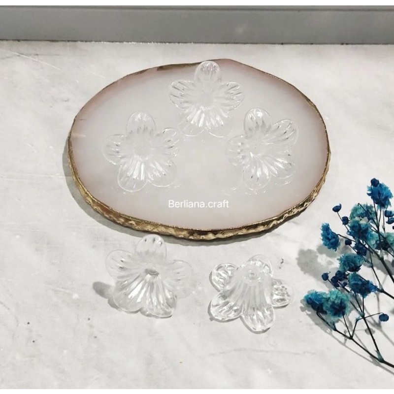 Mote Kelopak Bunga Bening 5 Kelopak, ukuran diameter 26mm, tinggi 13 mm Bentuk seperti corong Berat sekitar 20g, isi 16 pcs Harga grosir mulai 22 pack (dikirim dalam kemasan besar)