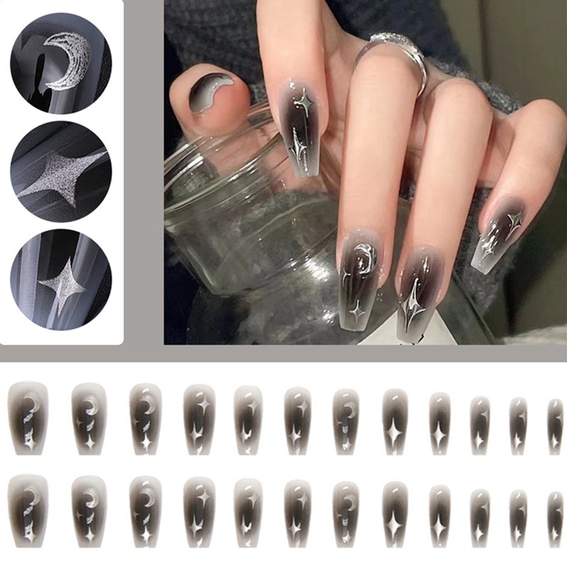 Perawatan & Kecantikan > Perawatan Kuku > Kuku Palsu > 24pcs /Box Ins Gaya Hitam Perak Pola Bulan Bintang Lucu Tekan Pada Tips Kuku Selesai Penuh Penutup Kuku Buatan Mulus Yang Dapat Dilepas Kuku Palsu