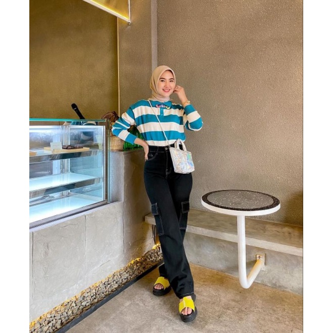 (27-30) HITAM LIST HW CARGO LOOSE JEANS / BLACK HW CARGO LOOSE JEANS / CELANA HIGHWAIST CARGO LOOSE JEANS WANITA CEWEK