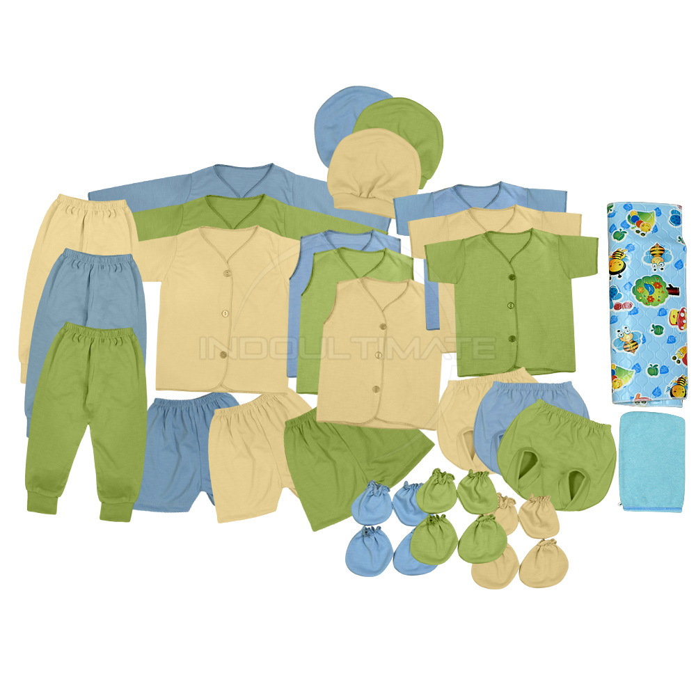 SET 29in1 PAKET T1 Perlengkapan bayi baru lahir • 3 Pcs Atasan lengan kutung = LD 22 cm, Panjang = 27 cm • 3 Pcs Celana Pop Kacamata = Lebar Pinggang 12 cm (bisa melar 25 cm), Panjang = 19 cm • 3 Pcs Atasan lengan pendek = LD 21 cm, Panjang = 27 cm • 3 Pcs Celana Pendek = Lebar Pinggang 13 cm (bisa melar 25 cm), Panjang = 19 cm • 3 Pcs Atasan Lengan Panjang = LD 21 cm, Panjang = 27 cm • 3 Pcs Celana Panjang = Lebar Pinggang 12 cm (bisa melar 25 cm) , Panjang 35 cm • 3 Pasang Sarung Tangan • 3 Pasang Sarung Kaki • 3 Pcs Topi Bayi = Diameter kurang lebih 12 cm • 1 Pcs Waslap = 12 cm x 17 cm • 1 Perlak = 42 cm x 36