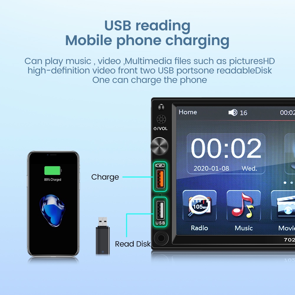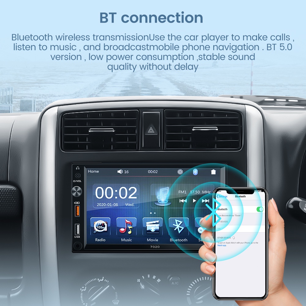 Video perkenalan produk 2DIN 7 inci Radio Mobil Double DIN Bluetooth 5.1 Input AUX Ganda Head Unit MP5 Player dengan USB Screen Mirroring untuk iPhone Android. Sumber: Shopee.