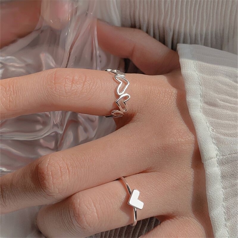 Detail 2pcs / Set Cincin Model Terbuka Adjustable Desain Hati Hollow Warna Emas / Hitam Untuk Wanita